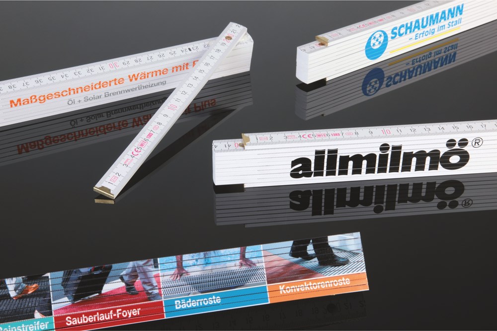 Besteller Blockmaßstab in sehr guter Qualität. Durch innenliegende Kunststoff-Gelenke liegen Glieder bündig aufeinander und ergeben eine sehr großer Werbefläche. Messungen für z. B. Dach- oder Treppenneigungen dank Winkelskalierung auf 2. Glied möglich. Weiße Gliederenden. Vollflächiger UV-Digitaldruck auf den Hochseiten möglich.