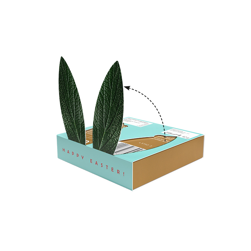 Lindt Mini Pralinés in Pralinenschachtel im Oster-Werbeschuber mit Hasenohren zum Herausbrechen und Aufstellen, individuell bedruckt. Inhalt: Lindt kleine Kostbarkeiten Goldhase mit 7 LINDOR Eiern, bunt gemischt und 1 Goldhasen, 42 g