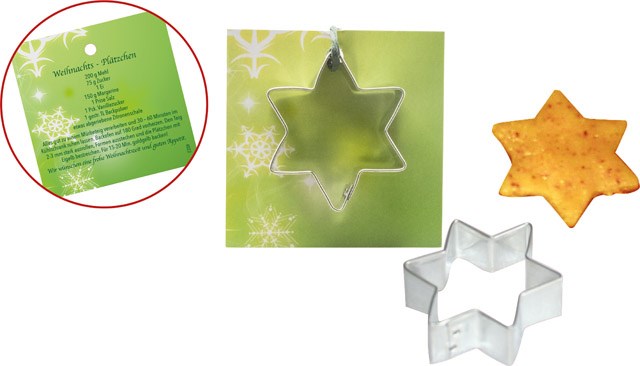 Ein minimalistisches und nachhaltiges Werbepräsent in der Adventszeit. Die Ausstechform ist immer wieder verwendbar. Das passende Rezept ist auf der Rückseite der Karte aufgedruckt. Die Karte im Standardmotiv lässt sich für Ihren Werbeeindruck nutzen, eine individuelle Gestaltung ist ebenfalls ab 250 Stück möglich. Inhalt: Ausstechform Stern, ca. 5 cm