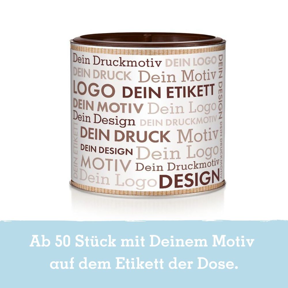 Ab 50 Stück mit Ihrem Motiv im 4c Druck auf dem Etikett der Dose: Das perfekte Sommer Give-away schmilzt im Mund, nicht beim Versand. Funktioniert auch ohne Eismaschine. Das Eispulver braucht nur noch einen Schuss Sahne und Milch, ein paar Stunden im Gefrierfach und fertig ist die eisige Leckerei. Und der Veredelungskreativität mit Schoko- oder Nussstückchen sind ohnehin keine Grenzen gesetzt. Mit Premium Kakao für einen maximalen Schokogenuss. Dieser Artikel ist vegan, laktosefrei und glutenfrei und kann auch mit Milchersatzprodukten zubereitet werden.