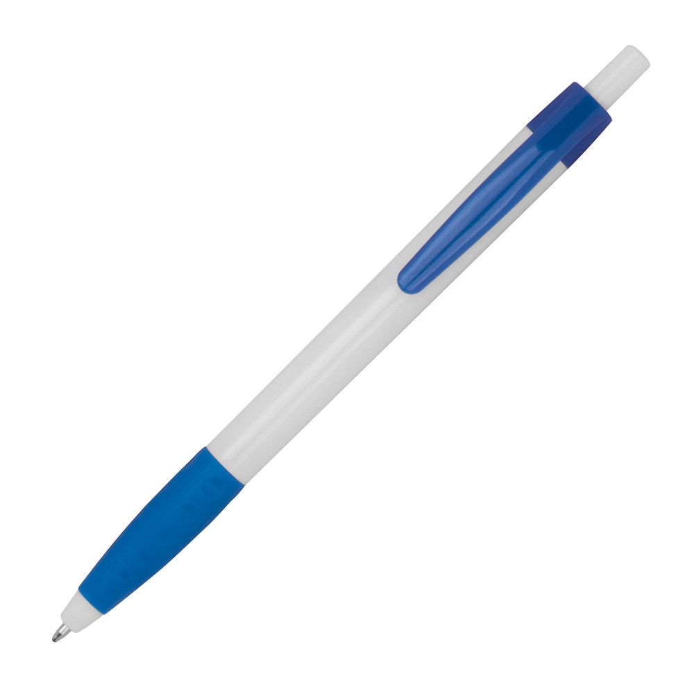 Kugelschreiber aus Kunststoff mit farbigen Akzenten und einer gummiertem Griffzone. Der Kugelschreiber verfügt über eine blauschreibende Kunststoffmine. Ihre Werbung drucken wir rechts vom Clip.