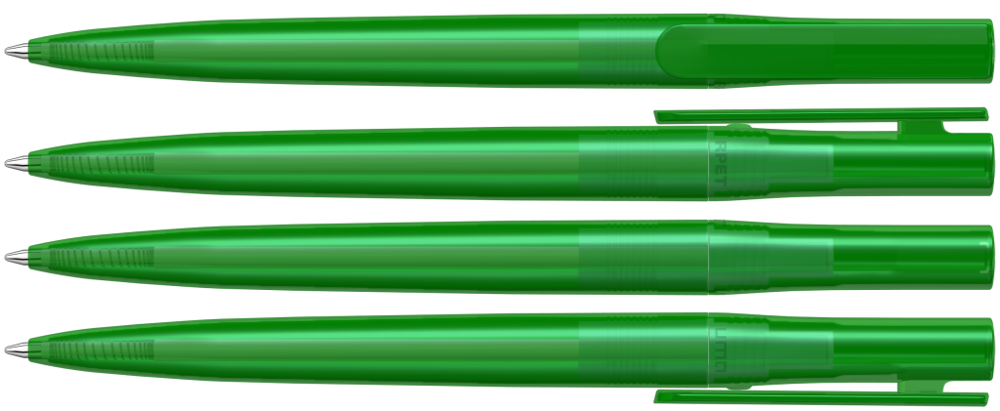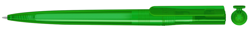 Drehkugelschreiber aus recyceltem PET-Material mit transparent glänzendem Gehäuse.