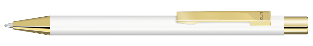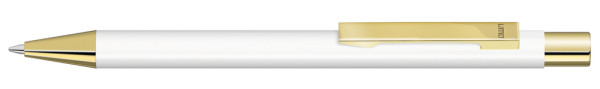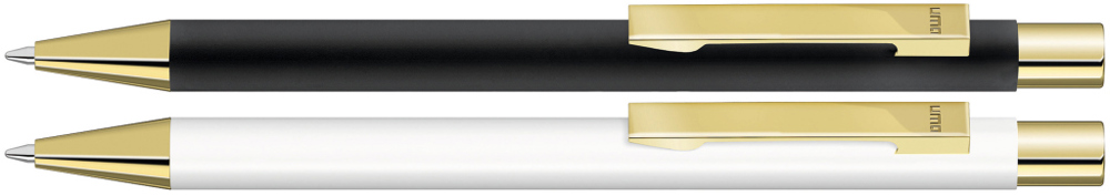 Metall-Druckkugelschreiber mit mattem Gehäuse in weiß oder schwarz. Metallclip, Metallspitze und Drücker gold glänzend.