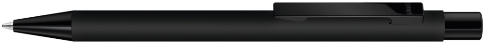 Metall-Druckkugelschreiber mit Softtouch-Gehäuse. Metallclip, Metallspitze und Drücker schwarz glänzend.