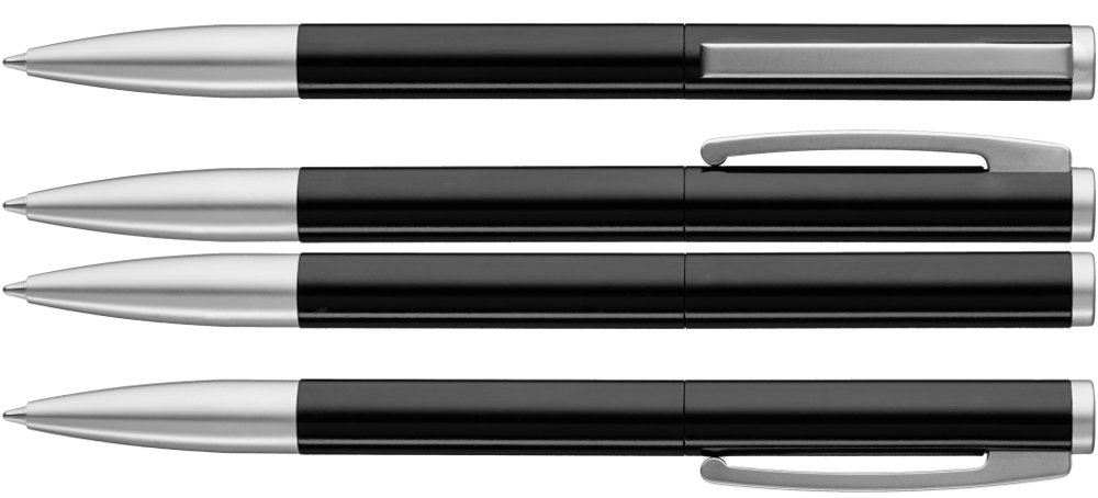 Metall-Drehkugelschreiber mit gefedertem Clip. Oberfläche in silber matt mit glänzenden Beschlagteilen oder schwarz bzw. weiß glänzend mit matten Beschlägen.