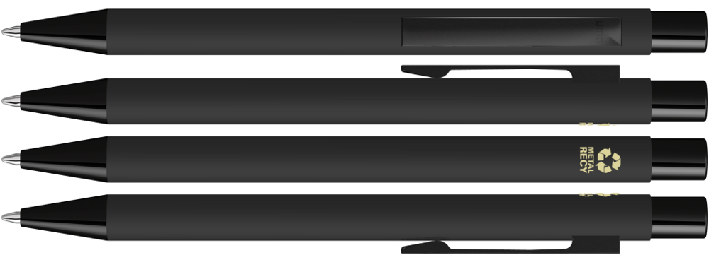 Metall-Druckkugelschreiber mit Softtouch-Gehäuse aus recyceltem Metall. Metallclip, Metallspitze und Drücker schwarz glänzend.