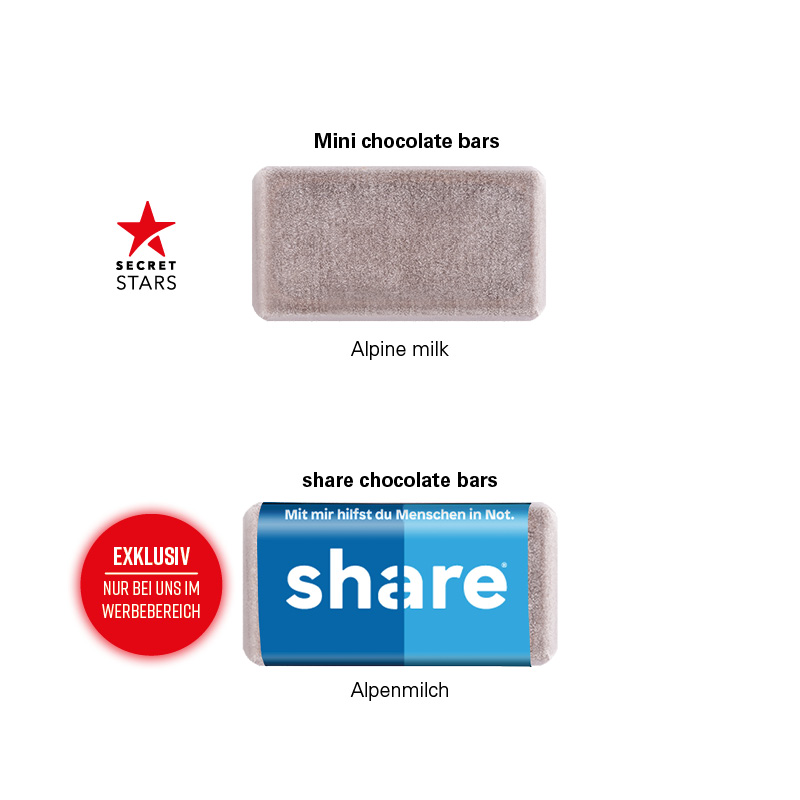 Adventskalenderturm in Vollkartonhülle mit Papierblister, rundum individuell bedruckt. mit 5 Werbeflächen. Inhalt: 24 share Schokotäfelchen mit Banderole aus weißem Papier eingewickelt in Pergaminpapier (kann über die Papiertonne entsorgt werden), 72 g