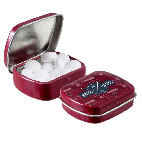 Mikro Klappdeckeldose weiß mit ca. 9 Gramm Pfefferminz, 4c-Euroskala bedruckt, mit Zutatenaufkleber und eingeschweißt
