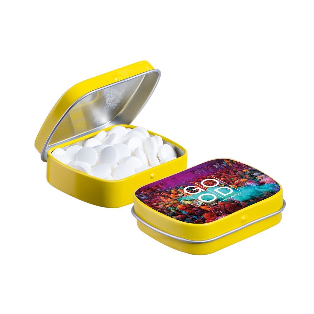 Mini Klappdeckeldose weiß mit ca. 23 Gramm Pfefferminz, 4c-Euroskala, inkl. Zutatenaufkleber und eingeschweißt