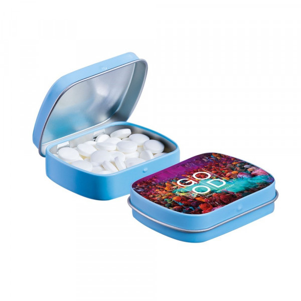 Mini Klappdeckeldose weiß mit ca. 23 Gramm Pfefferminz, 4c-Euroskala, inkl. Zutatenaufkleber und eingeschweißt