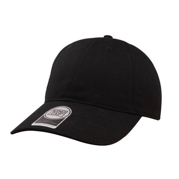6 Panel Cap ohne Frontfütterung. Low profile. Mattschwarze Schnalle und Öse. Hergestellt aus recycelter Baumwolle