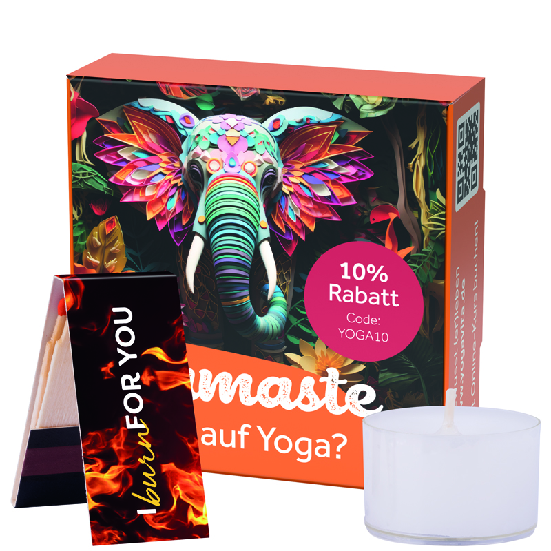 Kleine Klappbox aus weißem Karton, individuell bedruckt. Inhalt: 4 Teelichter und 1... mehr