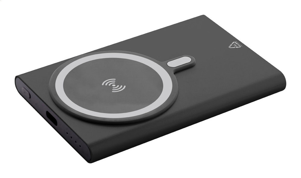 Powerbank aus recyceltem Aluminium mit eingebautem magnetischem Wireless-Charger (15 W) und 5000 mAh Akku. Mit USB-C-Eingang und Ladebuchse. Inklusive selbstklebendem Metallring zur Nutzung der Magnetfunktion auf jedem kabellos aufladbaren Gerät. Kompatibel mit iPhone® 12 oder neuer. Inklusive USB-Ladekabel.