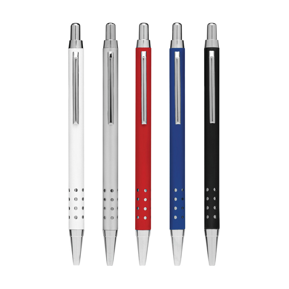 Aluminium-Kugelschreiber BUKAREST: mit Aluminium-Schaft, Griffzone mit Loch-Design, Druckmechanismus, Großraummine, blauschreibend