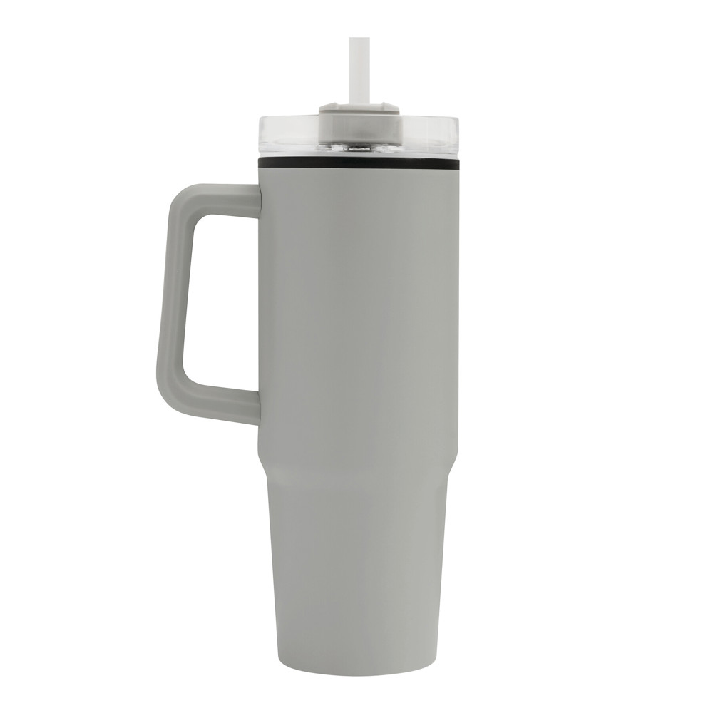 Trinkbecher DRINK ULTY, doppelwandig: innen aus Kunststoff und außen aus Edelstahl, mit praktischem Griff, transparenter Kunststoff-Deckel mit sicherem Schraubverschluss, Silikon-Dichtring, Trinköffnung mit Drehverschluss und transparentem Strohhalm, beschichteter Boden für gute Oberflächenhaftung, Füllmenge ca. 900 ml, hält ca. 2 Stunden warm und bis zu 4 Stunden kalt, in Box