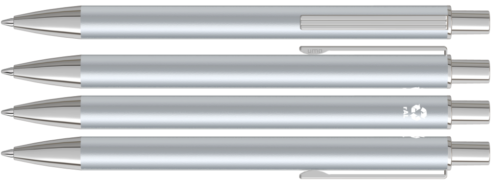 Metall-Druckkugelschreiber mit matter Oberfläche aus recyceltem Aluminium. Metallclip mit eingelassenen Rillen, Metallspitze und Drücker in silber glänzend.