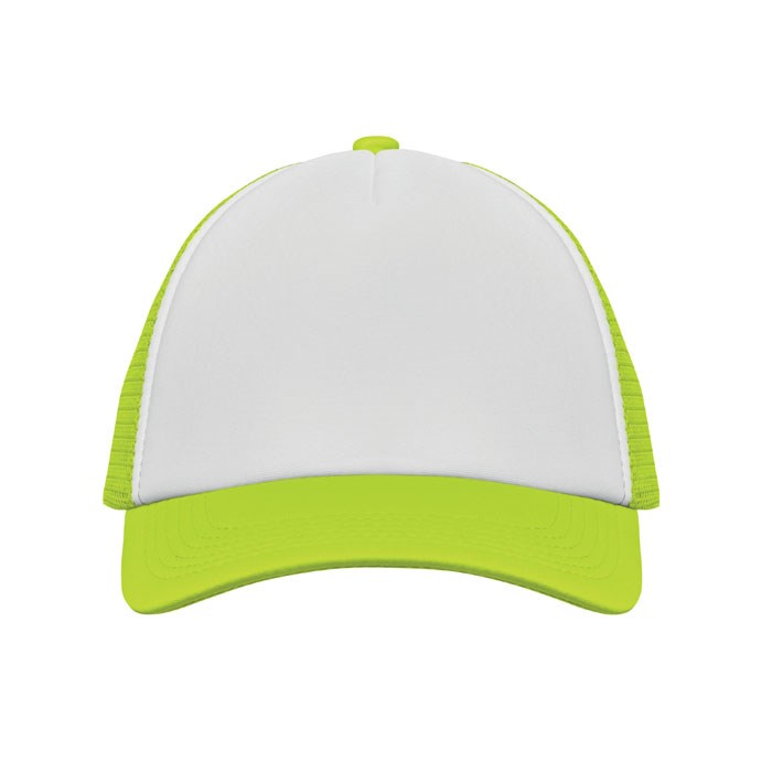 Trucker Kappe. 5 Panele. 140-150 gr/m2 Polyester. Verstellbarer Kunststoffverschluss. Weißes Frontpanel, farbiger Kappenschirm aus Polyester Jersey mit Schaum-Verstärkung. Weitere Panele aus Mesh. Größe 7 1/4.