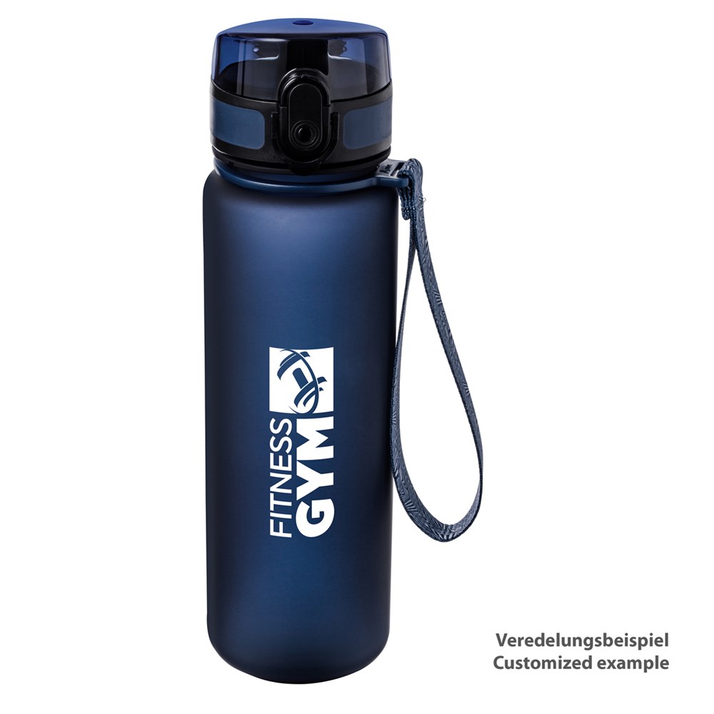 Die Sporttrinkflasche aus Tritan hat einen Sportverschluss zum einhändigen Öffnen, eine Trageschlaufe, ist sehr strapazierfähig und fasst insgesamt 500 ml.
