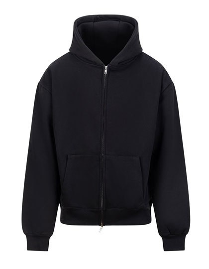 Ringgesponnene Baumwolle | 10% recycelter Polyester | Oversized-Passform | Schweres Material | Doppellagige Kapuze mit drei Segmenten | YKK-Zwei-Wege-Reißverschluss | Keine Kordelzüge | Gerippte Ärmelabschlüsse und Saum | Gebürstetes Innenvlies | Abreißetikett | 100 % Baumwoll-Obermaterial