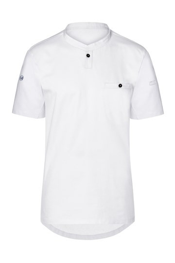 Vorderseite: Köpergewebe; Rückseite: Jersey-Piqué, atmungsaktiv und feuchtigkeitsregulierend | Modernes Arbeitsshirt mit kurzen Ärmeln im sportlich edlem Look | Tailliert geschnitten | Hohe Waschbarkeit | Halsausschnitt mit schmalem Stehkragen und kleiner Knopfleiste | Brustleistentasche mit Knopf | Leistentasche am linkem Ärmel