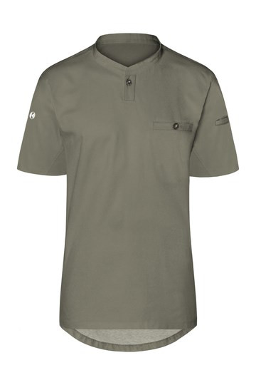 Vorderseite: Köpergewebe; Rückseite: Jersey-Piqué, atmungsaktiv und feuchtigkeitsregulierend | Modernes Arbeitsshirt mit kurzen Ärmeln im sportlich edlem Look | Tailliert geschnitten | Hohe Waschbarkeit | Halsausschnitt mit schmalem Stehkragen und kleiner Knopfleiste | Brustleistentasche mit Knopf | Leistentasche am linkem Ärmel
