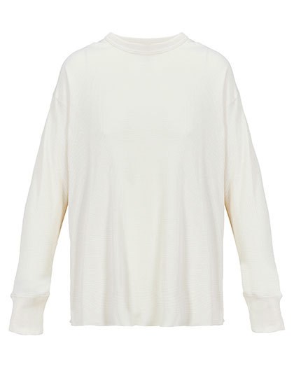 Ungefärbte Baumwolle, davon 20% recycelt | Geschnitten und genäht | Lange Ärmel mit Ripp-Bündchen | Ausschnitt und Overlock-Nähte an der Unterseite aus Ripp-Gewebe | Lockere Passform