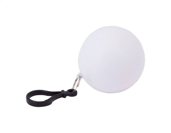 Regenponcho, gefaltet in rundem Schlüsselanhänger mit Karabiner.
