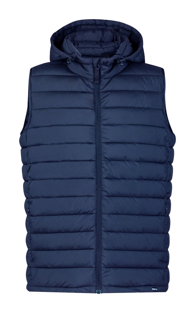 Wind- und wasserabweisende Bodywarmer-Weste mit Reißverschluss, Seitentaschen mit Reißverschluss und verstellbarer Kapuze. Mit RPET-Polyester-Beutel. Material: 100 % RPET-Polyester. Mit RPET-Label.