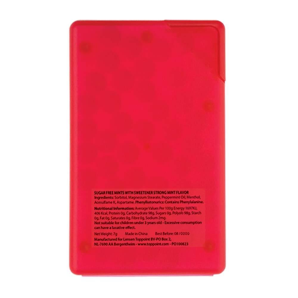 Rechteckiger Pfefferminzspender mit ca. 7g zuckerfreien Pfefferminz. mehr