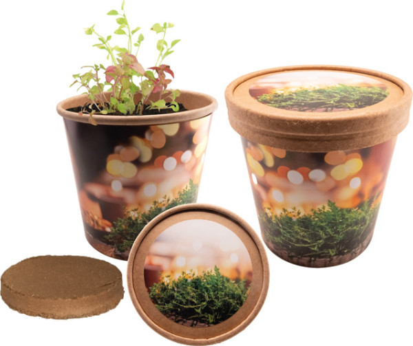 Frische Kräuter für das weihnachtliche Festmahl ernten. Das gelingt mit unseren Samen im natürlichen Kraftpapierbecher. Schon ab 250 Stück können das Etikett und die Banderole für Ihre Werbebotschaft oder mit einer eigenen Gestaltung eingesetzt werden.