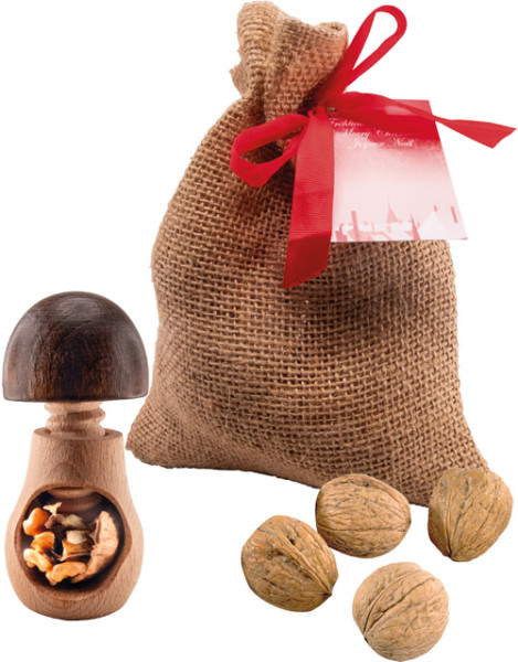Ab Herbst, wenn die Nüsse reif sind, kommt dieser besondere Nussknacker zum Einsatz. Er ist zusammen mit ca. 80 g Walnüssen in einem Jutesäckchen mit rotem Bändchen verpackt. Platz für Ihren Werbeeindruck ist auf dem Anhängekärtchen ab 250 Stück. Eine eigene Gestaltung ist ebenfalls ab 100 Stück möglich.