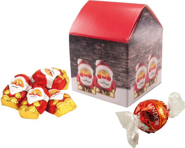 Unser süßes Weihnachtshäuschen ist ideal als Giveaway in der Adventszeit. Die Lindt Schoko-Kugel und die Schoko-Weihnachtsmännchen sind immer willkommen. Ihre Werbebotschaft kann im Standardmotiv platziert werden. Eine individuelle Gestaltung ist ebenfalls ab 250 Stück möglich. Inhalt: Lindt Schoko-Kugel (12,5 g), 4 Schoko-Weihnachtsmännchen (je 5 g)