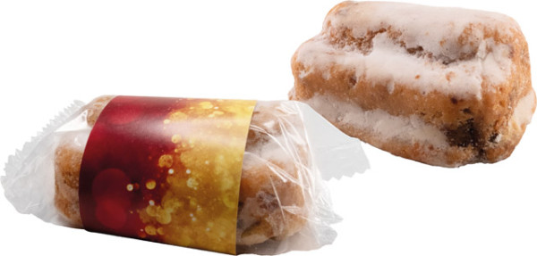 Ein feiner Christstollen aus erlesenen Zutaten. Der Klassiker im Miniformat ist das perfekte Präsent in der Adventszeit. Ihr Logo findet Platz im Standardmotiv der Banderole. Alternativ kann, ebenfalls ab 250 Stück, die Banderole komplett personalisiert werden.