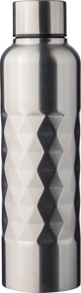 Es handelt sich um eine einwandige Trinkflasche aus recyceltem Edelstahl (800 ml) mit rautenförmiger Textur auf dem Körper, Schraubdeckel und einem lasergravierten Recycling-Logo. Sie wurde aus Edelstahl 304 hergestellt. Sie ist einzeln verpackt in einer braunen Pappschachtel.