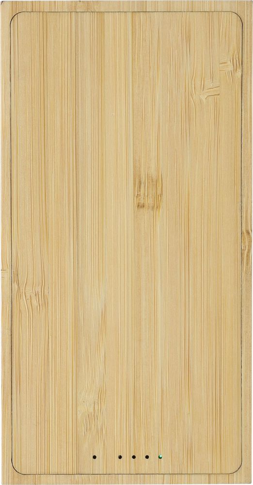 Die Bambus-Solarstrombank verfügt über eine Kapazität von 10.000 mAh, zwei USB-A-Ausgänge sowie zwei Typ-C-Anschlüsse für Eingang und Ausgang. Auf der Rückseite befindet sich ein Wireless Charger mit einem lasergravierten Symbol und fünf Kontrollleuchten. Auf der Oberseite ist ein 6,3 x 12,8 cm großes Solarpanel angebracht. Der kabellose Ausgang beträgt 5 V DC/1 A (5 W), der kabellose Ladeabstand 6 mm. Eingang/Ausgang über Kabel: DC 5 V/2,4 A. Die Powerbank ist mit Kurzschluss-, Überladungs- und Überentladungsschutz ausgestattet. Ein 30 cm langes weißes Kabel ist inklusive. Das Produkt ist einzeln in einer braunen Pappschachtel verpackt.
