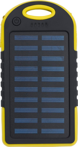 Gummierte ABS-Solarstrom-Powerbank mit grünen Kontrollleuchten und einer seitlichen Taschenlampe. Zwei USB-Anschlüsse und ein USB-C-Anschluss. Solarladung 5V/200mA. Eingang DC 5V/1A. Ausgang DC 5V/2x1A. Kapazität: 4.000mAh. Inklusive USB-Kabel.