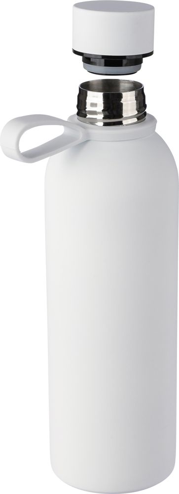 Diese doppelwandige Vakuum-Trinkflasche aus recyceltem Edelstahl (500 ml) ist mit einer Innenseite aus Edelstahl 304 und einer Außenseite aus Edelstahl 201 versehen. Sie ist mit einer gummierten Beschichtung für eine weiche Haptik ausgestattet. Sie verfügt über einen Schraubdeckel aus PP mit Metalldetails und eine Silikon-Trageschlaufe. Auf dem Korpus ist ein Recycling-Logo eingraviert. Die Flasche ist einzeln verpackt in einer braunen Pappschachtel.