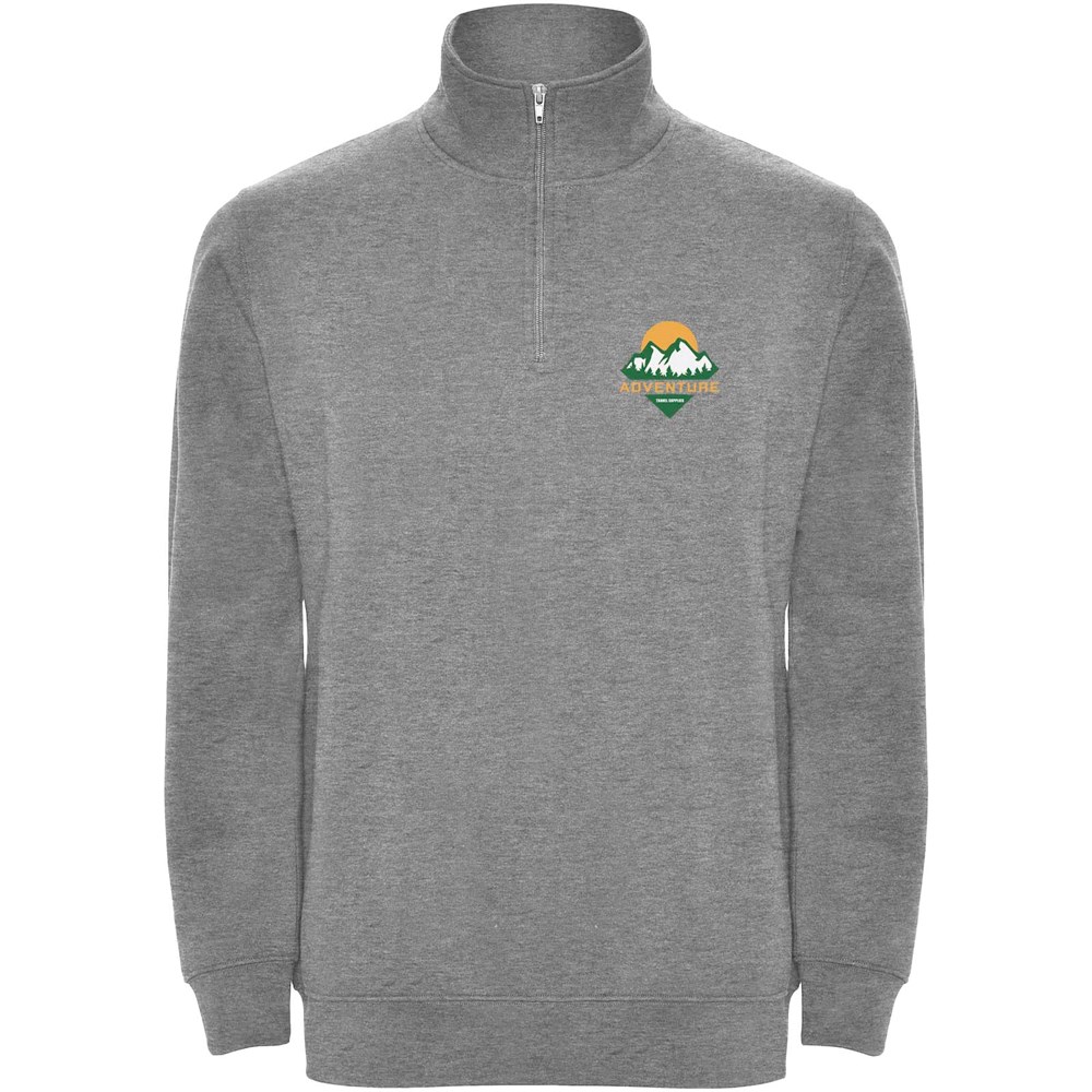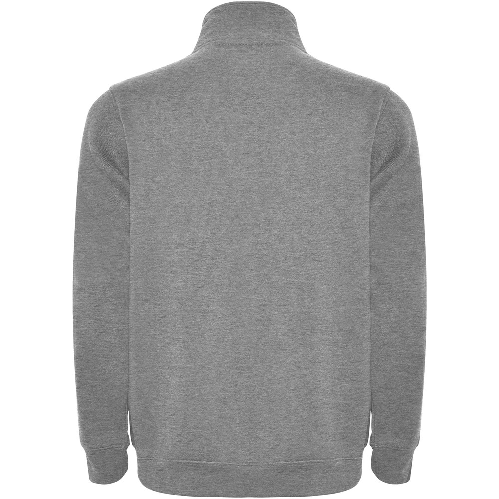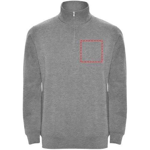 Sweatshirt mit passendem halben Reißverschluss und Polokragen. Passender Innenkragen. Verstärkte, abgedeckte Nähte am Innenkragen. 1×1 Rippbündchen an Ärmeln und Taille. Das Modell ist 185 cm groß und trägt Größe M.
