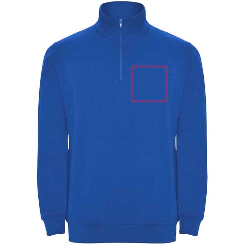 Sweatshirt mit passendem halben Reißverschluss und Polokragen. Passender Innenkragen. Verstärkte, abgedeckte Nähte am Innenkragen. 1×1 Rippbündchen an Ärmeln und Taille. Das Modell ist 185 cm groß und trägt Größe M.