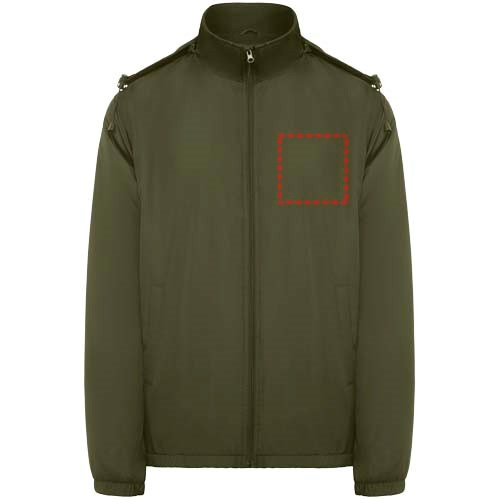 Leichte, wasserabweisende Jacke. Hoher Kragen und einrollbare, verstellbare Kapuze. Innenfutter aus Microfleece. Front-Reißverschluss und Kinnschutz. Elastische Ärmelbündchen. Zwei Seitentaschen mit Reißverschluss. Innere Brusttasche links. Herausnehmbares Etikett. Wasserabweisend. Winddicht. Das männliche Modell ist 184 cm groß und trägt Größe L, das weibliche Modell ist 174 cm groß und trägt Größe S.