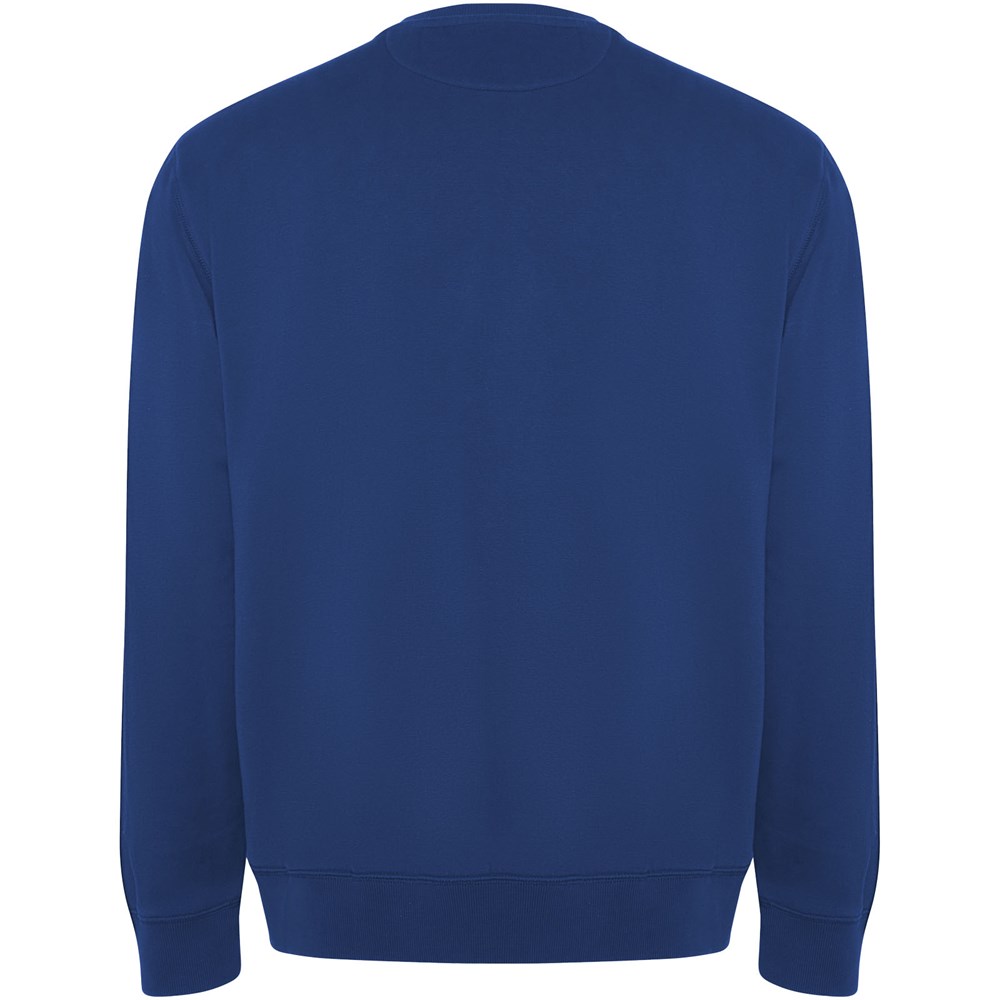 Unisex-Pullover aus gekämmter Bio-Baumwolle und recyceltem Polyester. Kragen, Bündchen und Saum aus 2×1 Rippstrick. Ziernähte an Schultern, Armausschnitt, Kragen, Bündchen und Saum. Halbmondförmige Naht hinten am Innenkragen. Herausnehmbares Etikett. Einzelverpackung aus recyceltem Material. Das Modell ist 190 cm groß und trägt Größe L.