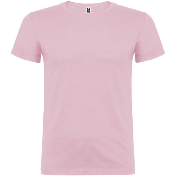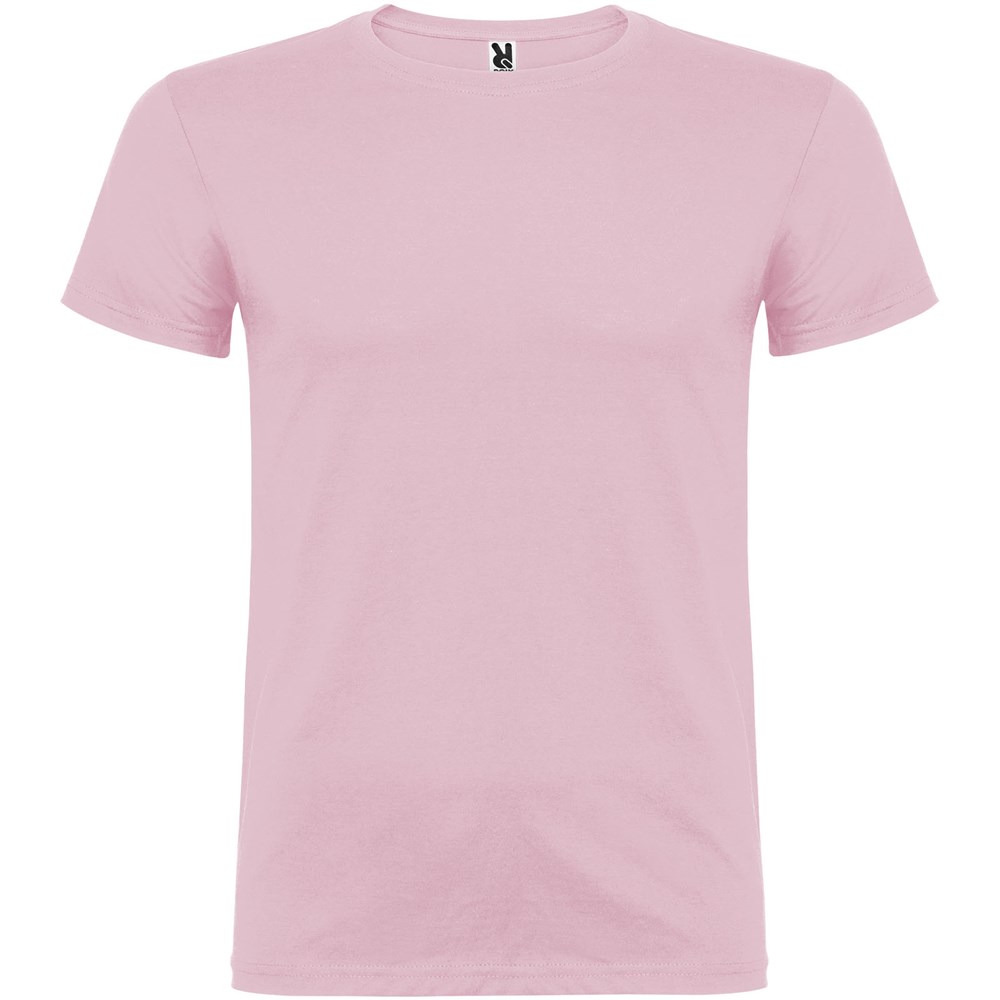 Kurzärmeliges T-Shirt mit doppellagigem Rundhalsausschnitt aus Elasthan, hergestellt aus schlauchförmigem Material für Erwachsene. Verstärkte und verdeckte Nähte am Kragen. Herausnehmbares Etikett. Das Modell ist 190 cm groß und trägt Größe L.