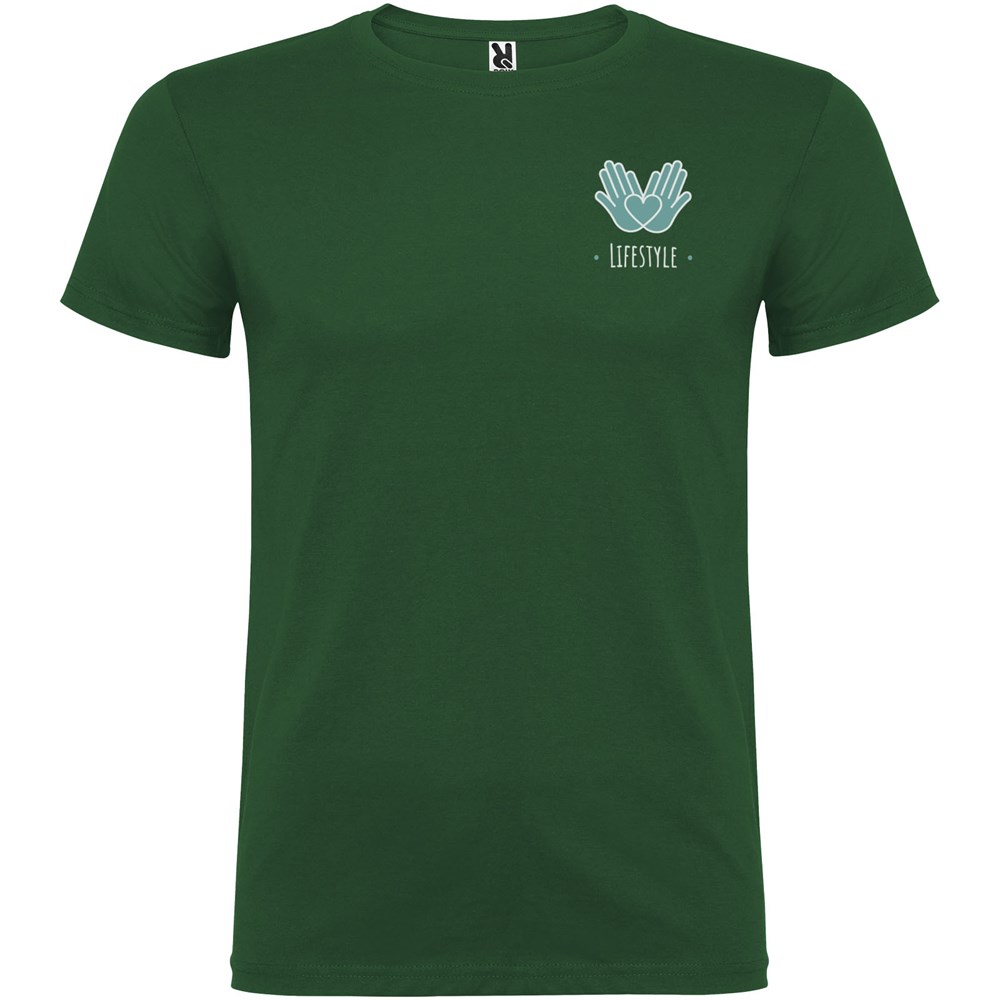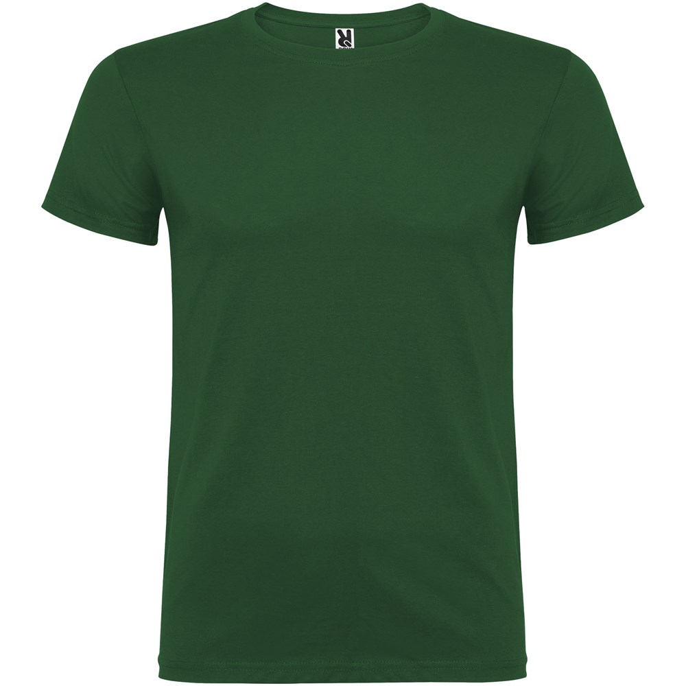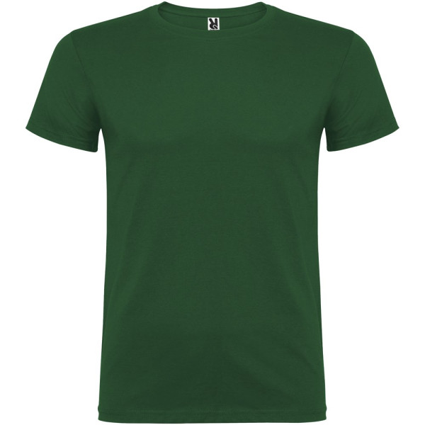 Kurzärmeliges T-Shirt mit doppellagigem Rundhalsausschnitt aus Elasthan, hergestellt aus schlauchförmigem Material für Erwachsene. Verstärkte und verdeckte Nähte am Kragen. Herausnehmbares Etikett. Das Modell ist 190 cm groß und trägt Größe L.
