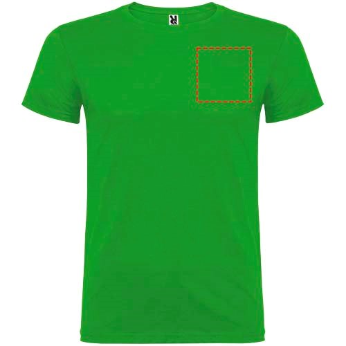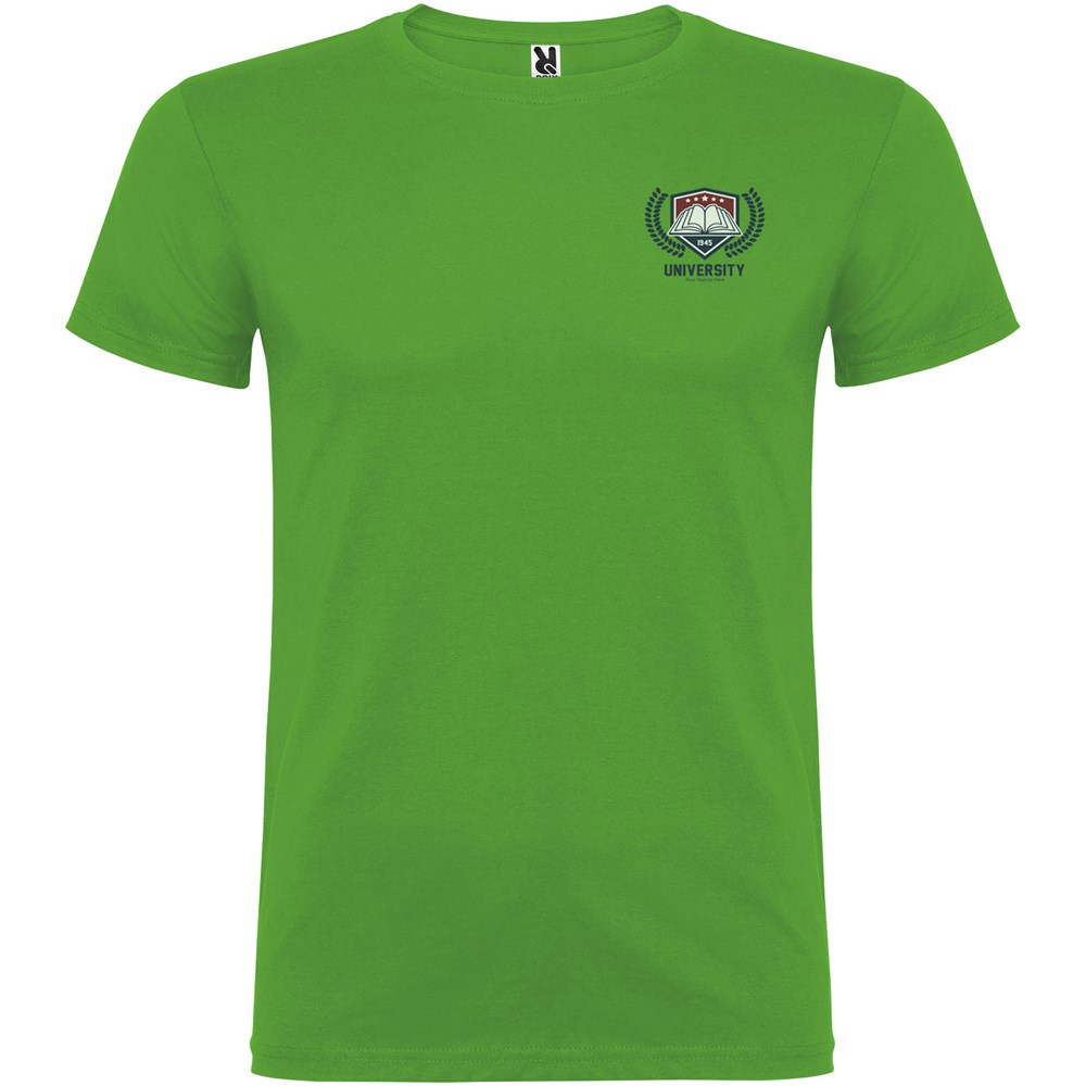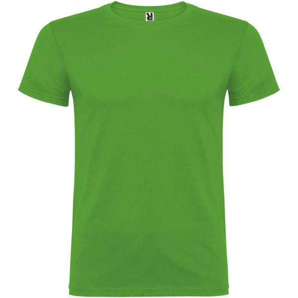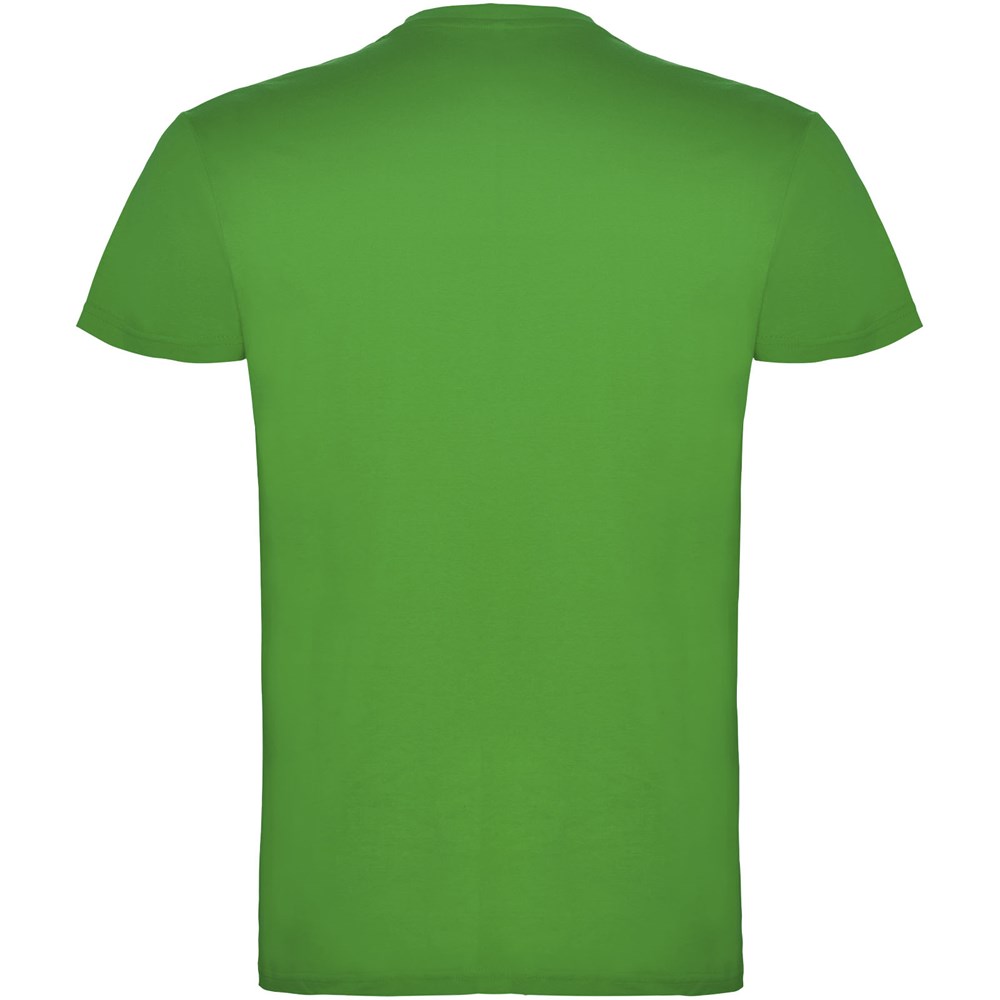 Kurzärmeliges T-Shirt mit doppellagigem Rundhalsausschnitt aus Elasthan, hergestellt aus schlauchförmigem Material für Erwachsene. Verstärkte und verdeckte Nähte am Kragen. Herausnehmbares Etikett. Das Modell ist 190 cm groß und trägt Größe L.
