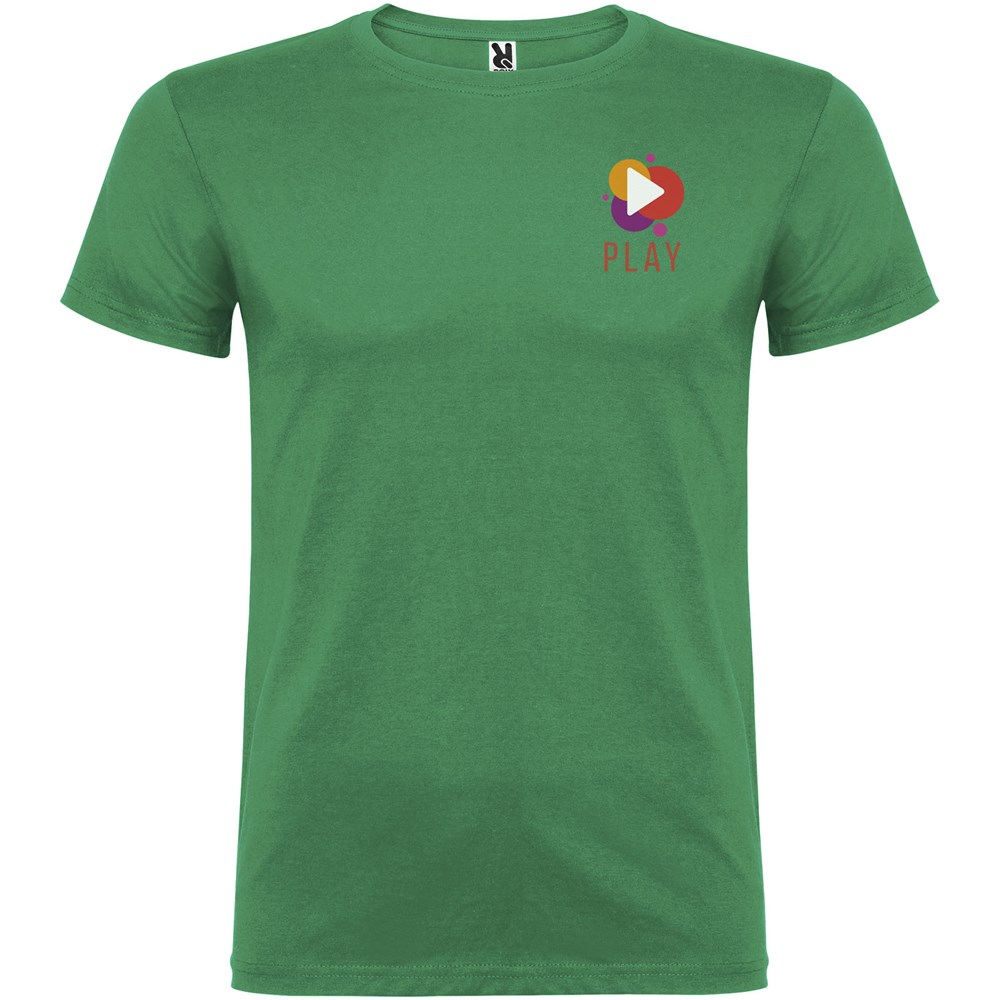 Kurzärmeliges T-Shirt mit doppellagigem Rundhalsausschnitt aus Elasthan, hergestellt aus schlauchförmigem Material für Erwachsene. Verstärkte und verdeckte Nähte am Kragen. Herausnehmbares Etikett. Das Modell ist 190 cm groß und trägt Größe L.