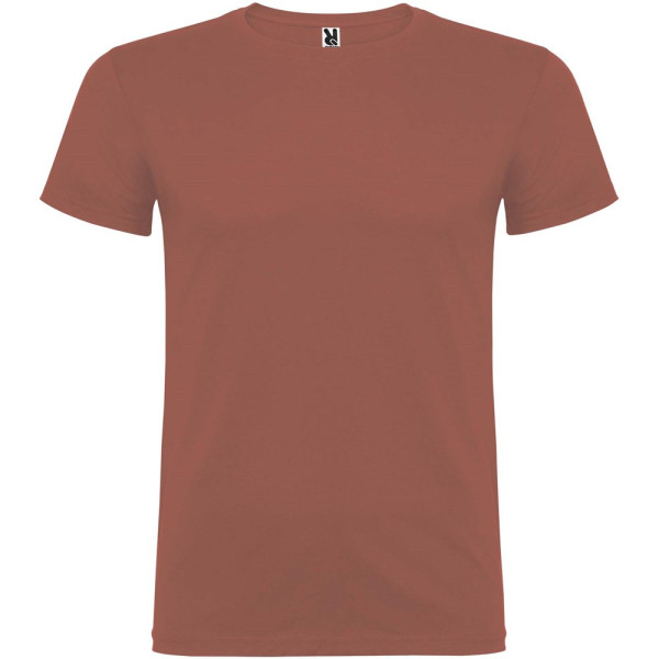 Kurzärmeliges T-Shirt mit doppellagigem Rundhalsausschnitt aus Elasthan, hergestellt aus schlauchförmigem Material für Erwachsene. Verstärkte und verdeckte Nähte am Kragen. Herausnehmbares Etikett. Das Modell ist 190 cm groß und trägt Größe L.