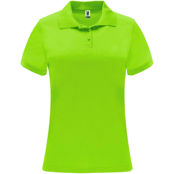 Kurzärmeliges Funktions-Poloshirt für Damen. Gestrickter Kragen mit 3-Knopfleiste. Figurbetonte Passform. Atmungsaktives, leicht zu waschendes und zu trocknendes Material. Herausnehmbares Etikett. Technisches Gewebe. Atmungsaktiver Stoff. Das Modell ist 173 cm groß und trägt Größe S.