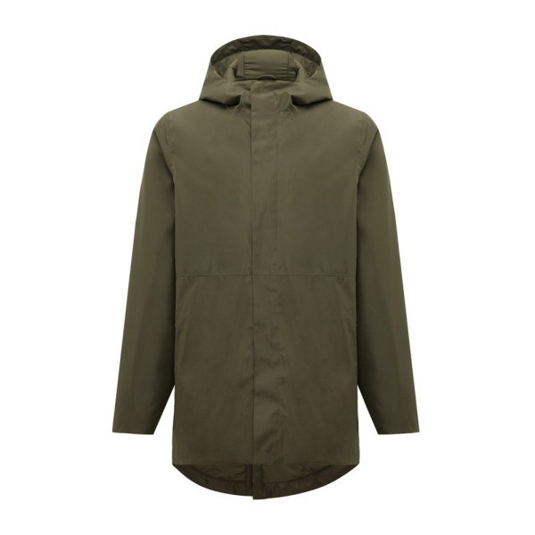 Unisex-Parka mit Wattierung, 4000mm wasserdicht, aus 100% recyceltem Polyester, atmungsaktiv & windabweisend. Er hat alle Merkmale eines klassischen Parkas: längere Rückenlänge, Rückenschlitz, 2-Wege-CF-Reverse-Reißverschluss, verdeckt durch eine Frontleiste mit vier verdeckten Druckknöpfen, Ärmelbündchen mit Innenmanschette, Kapuze mit Stoppern, horizontale Ziernähte. Er ist mit Sheets aus 100% recyceltem Polyester gefüttert und mit feinem Taft unterlegt. Auf der Innenseite hat er einen versteckten Reißverschluss am unteren Saum und auf der linken Brustseite des Trägers, das erleichtert eine Veredelung. Der gesamte Parka ist mit recyceltem Polyester-Garn genäht. Im Nacken hat er ein abreißbares Größenetikett. Die Verwendung von recyceltem Material und die Angaben zur Umweltverträglichkeit werden durch den Einsatz des disruptiven physikalischen Tracers AWARE™ und der Blockchain-Technologie garantiert. Durch Scannen des QR-Codes erhalten Sie Zugang zu einem speziellen digitalen Pass.