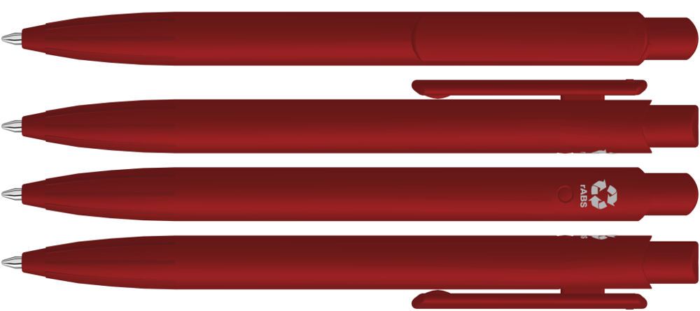 Druckkugelscheiber mit gedeckt mattem Gehäuse, Clip und Drücker aus recyceltem ABS-Kunststoff. Eingelassene Griffzone.