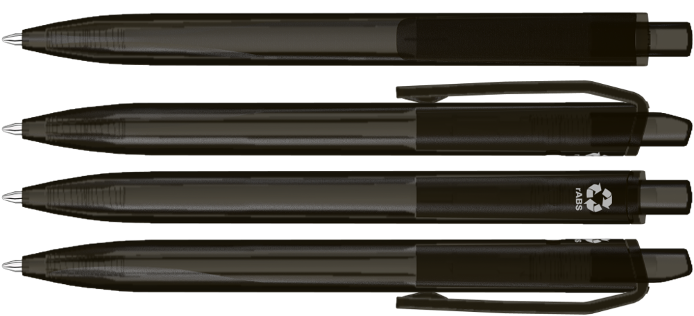 Druckkugelscheiber mit transparent gefrostetem Gehäuse, Clip und Drücker aus recyceltem ABS Kunststoff. Griffzone ergonomisch geformt.
